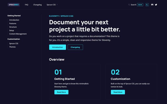 Welcome to the official documentation of Spruce Docs Elventy theme. A small template you can use to document any of your projects.